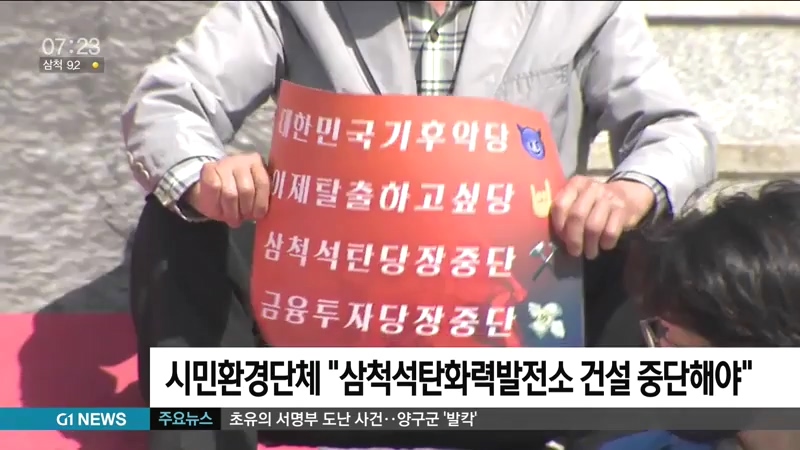 삼척석탄화력발전 반대투쟁위원회 등 전국 시민·환경단체는 어제(29일) 삼척시청 앞에서 기자회견을 열고 삼척석탄화력발전소 건설 중단을 촉구했습니다.
