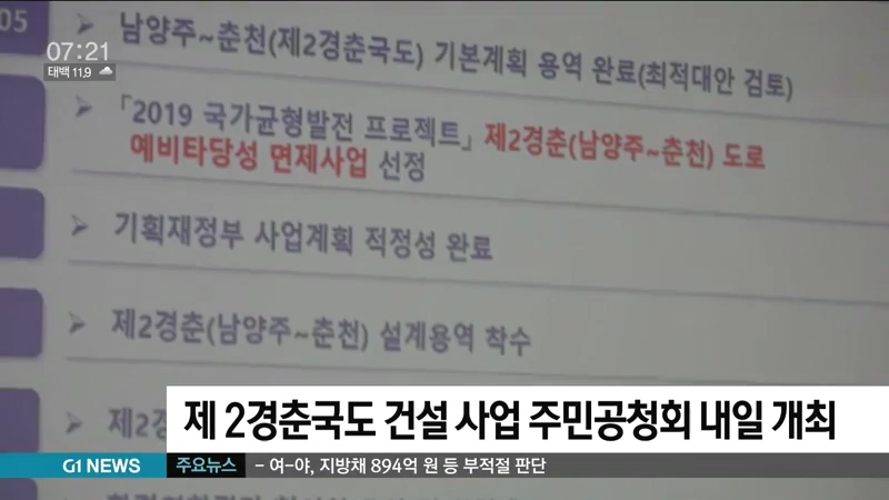 춘천시는 내일(14일) 제 2경춘국도 건설 사업의 기본설계용역과 전략환경영향평가 초안에 대해 주민 의견을 묻는 주민공청회를 개최한다고 밝혔습니다.