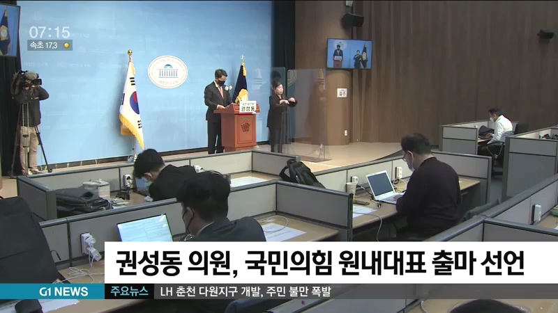권 의원은 국회 소통관에서 기자회견을 갖고, "문재인 정부 폭정의 비를 멈추게 하고자 원내대표에 도전한다"며, "오로지 대선 승리와 정권교체를 위해 헌신하겠다"고 출마 이유를 밝혔습니다.