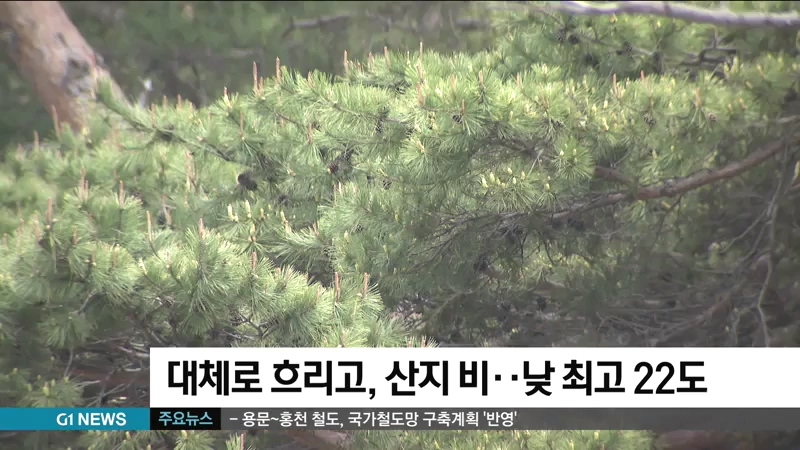 낮 최고기온은 영서권이 18도에서 22도, 영동권이 14도에서 16도의 분포로 어제보다 낮겠습니다.