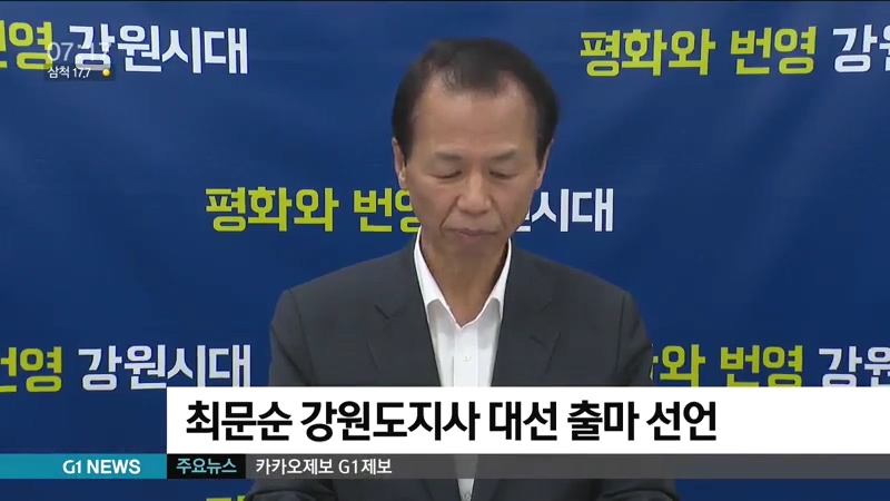 최문순 도지사는 어제 강원도청 기자실에서 "쉽지 않은 결정이었지만, 지역 문제와 분권을 대선 의제로 만들기 위해 민주당 대선 후보 경선에 참여하겠다"고 밝혔습니다.
