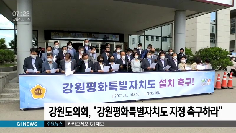 강원도의회는 한반도 평화 정착과 국토균형발전을 위한 '강원평화특별자치도' 지정을 촉구하라는 결의문을 채택했습니다.