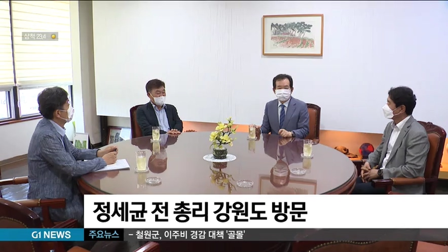 정 전 총리는 G1 방송 춘천 본사를 방문해 허인구 G1 방송 대표 등과 수소 산업과 의료 바이오 산업 등 도내 주요 현안을 논의했습니다.