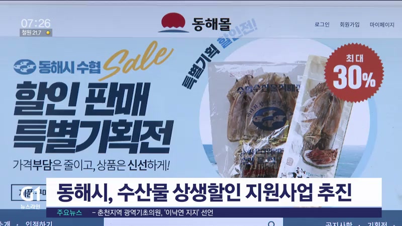 동해시는 다음달 15일까지 온라인 판로 확대와 지역 수산물 판매 촉진을 위해 동해몰과 강원마트 등 온라인 쇼핑몰에서 손질 오징어와 생선, 젓갈 등 20개 품목을 최대 30%까지 할인 판매할 계획입니다.