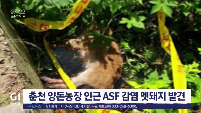 방역당국은 춘천시 신동면의 한 야산에서 어제(8일) 발견된 야생 멧돼지 폐사체 1마리에서 ASF가 검출됐다고 밝혔습니다.
