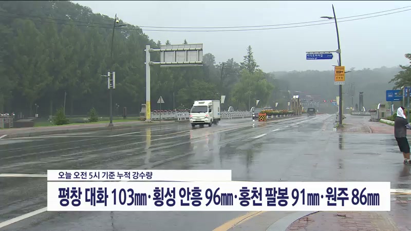 어제부터 오늘 새벽 4시까지 내린 비의 양은 평창 대화 94㎜, 홍천 팔봉 91㎜, 횡성 안흥 86㎜ 등 입니다.