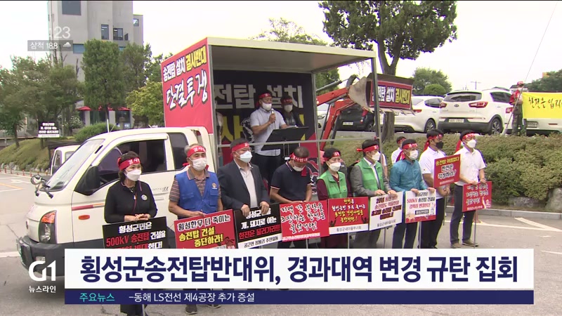 횡성군과 군의회, 송전탑 반대대책위원회 등은 어제 횡성군청 앞에서 집회를 열고, "한전은 군민들의 의견이 배제된 경과대역 변경 결정을 당장 철회하라"고 촉구했습니다.