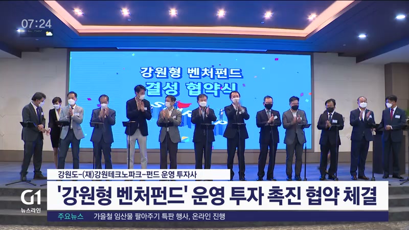 강원도와 강원테크노파크, 4개 펀드 운용사와 6개 펀드 투자사는 '강원형 벤처펀드' 운용과 투자 촉진을 위한 협약을 체결했습니다.