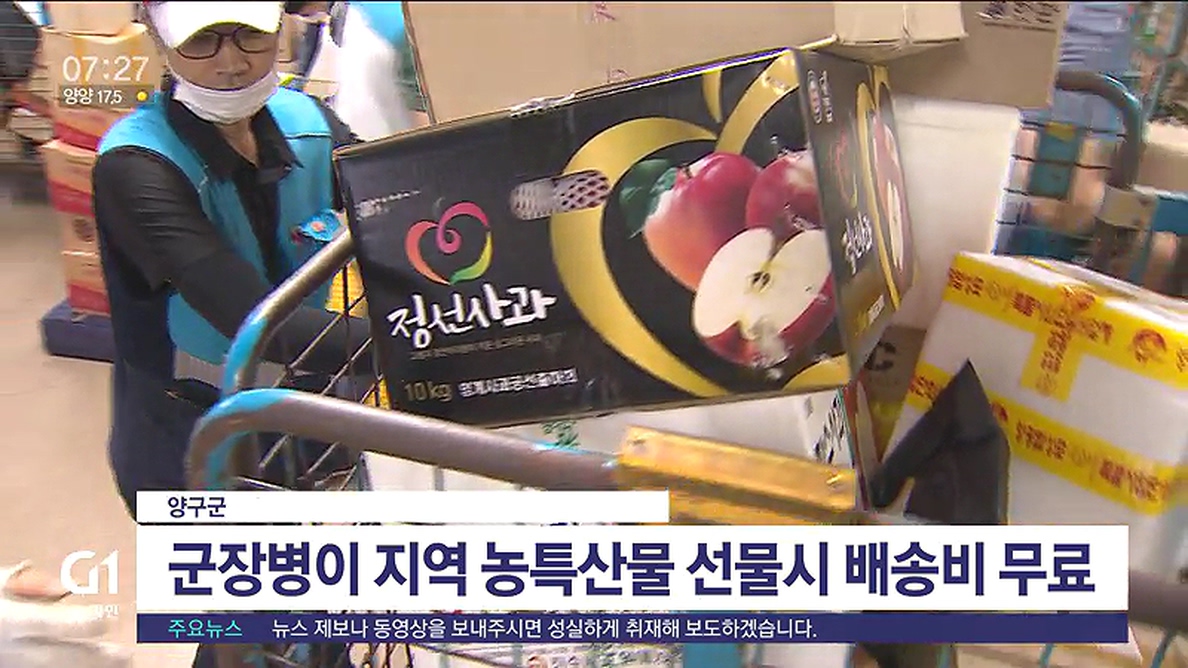 양구군은 오는 17일까지 지역내 부대에서 근무하는 장병이 군사우체국을 포함한 우체국에서 양구산 농특산물을 선물할 경우, 1인당 4,500원씩 배송비를 지원한다고 밝혔습니다.
