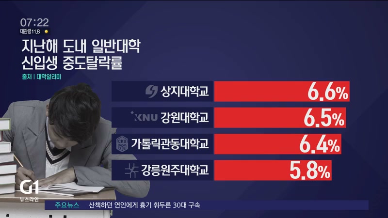 지난해 도내 일반대학 8곳 중 학교를 다니다가 중간에 이탈한 신입생 비율은 5.9%.