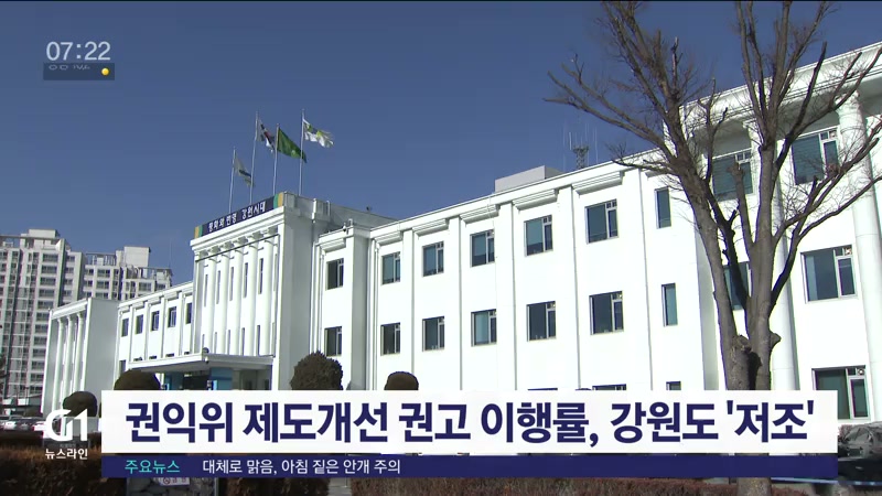 강원도가 국민권익위원회로부터 받은 제도 개선 권고 조치 이행률이 저조한 것으로 나타났습니다.