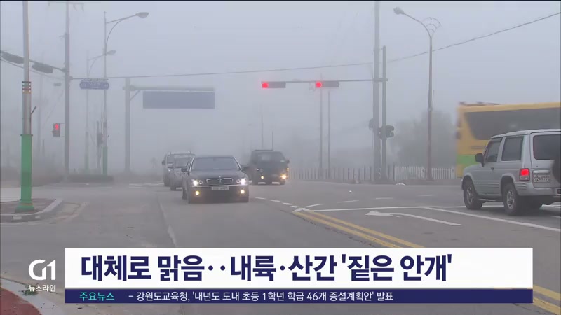 강원지방기상청은 내륙과 산간지역엔 안개가 끼는 곳이 많겠으며, 곳에따라 가시거리 200m 이하의 짙은 것도 있겠다며 교통안전에 주의해 줄 것을 당부했습니다.