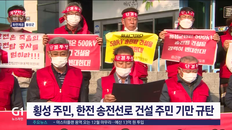 횡성군 송전탑 반대대책위와 이장협의회는 어제(26일) 횡성군청 앞에서 집회를 열고 한전이 송전선로 건설사업을 하며 주민을 기만했다고 주장했습니다.