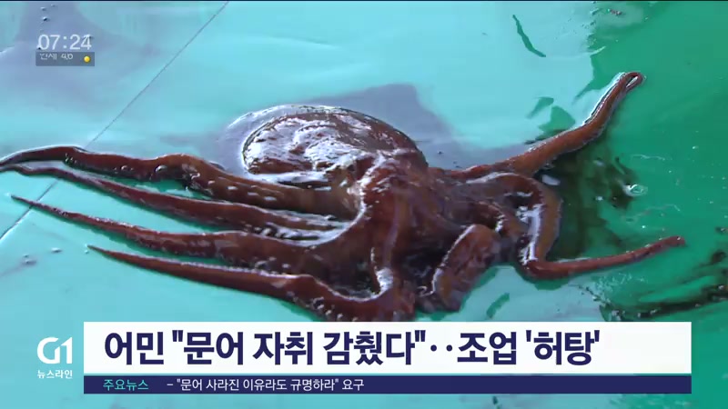 "문어가 원체 안나니까 KG당에 5만원 넘겨가고 어민들이 나가서 한두마리 잡는 사람이 과반수로 그냥 들어오는 사람이 수두룩하고 환동해본부에선 연승어민들을 대책을 마련해 주셔야겠습니다."