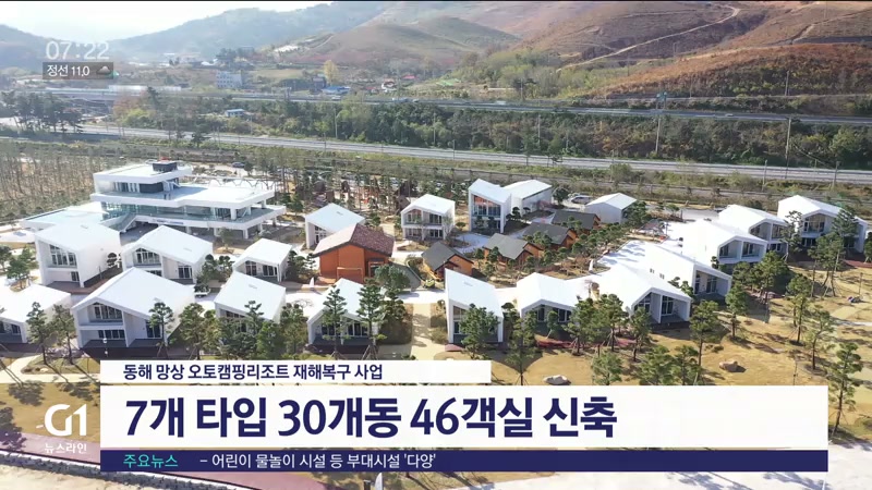 동해시는 산불 피해 흔적과, 화재에서 살아남은 오두막형 숙소도 남겨 리조트 재건의 의미를 더하고,