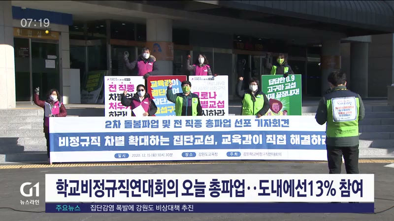 강원학교비정규직연대회의가 오늘(2일) 하루 총파업을 선언한 가운데, 도내에서는 전체 인원 중 13%인 천 백여 명이 참여하는 것으로 조사됐습니다.
