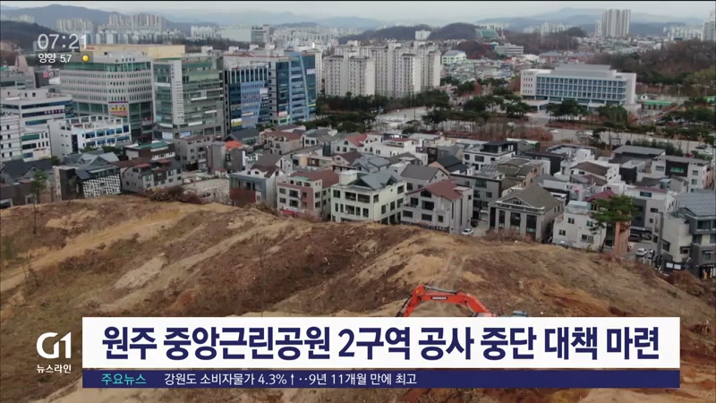 G1뉴스가 보도한 원주 중앙근린공원 2구역 조성 사업에 따른 주민 피해와 관련해 시행사 측이 공사를 일시 중단한데 이어 대책 마련에 나서기로 했습니다.