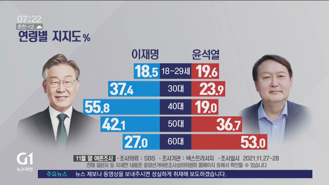 다른 연령층은 지지세가 뚜렷하고 한쪽으로 쏠려있는 반면,