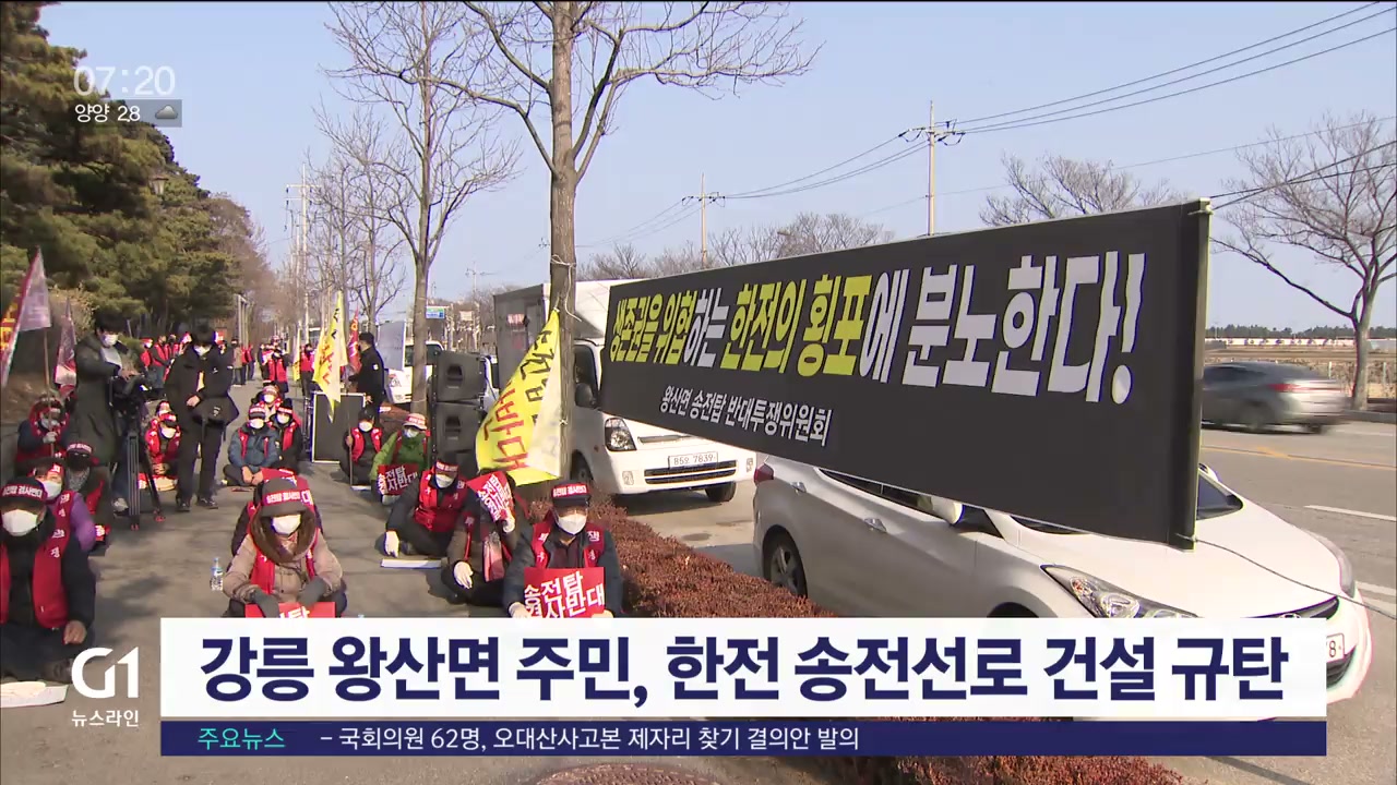 강릉 왕산면 송전탑 반대투쟁위원회는 어제(23일) 한국전력 강릉지사 앞에서 집회를 열고 한전이 송전선로 건설사업에 주민의견을 반영하지 않았다고 주장했습니다.