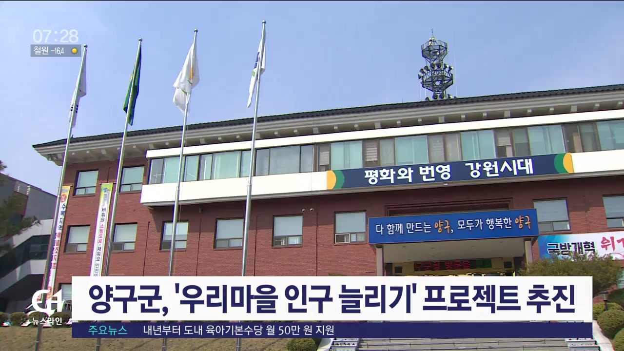 내년부터 추진되는 이번 프로젝트는 양구지역내 84개 마을을 대상으로 인구 증가 순위를 매겨, 5위까지 마을 숙원 사업 지원을 위한 인센티브를 최대 2천만 원까지 지원할 계획입니다.