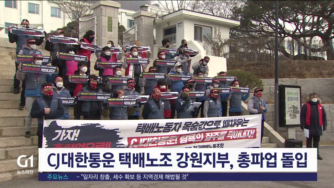 CJ대한통운 택배노조 강원지부가 어제(28일) 강원도청 앞에서 총파업 결의대회를 열고, 무기한 파업에 들어갔습니다.