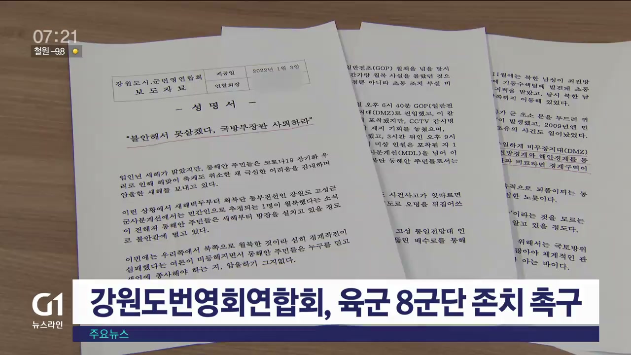 강원도시군번영회연합회는 성명을 내고 "새해 첫날 민간인 추정 1명이 월북해 주민들이 불안에 떨고 있다"며, 튼튼한 국방을 위해 해체 예정인 8군단을 존치하라고 촉구했습니다.