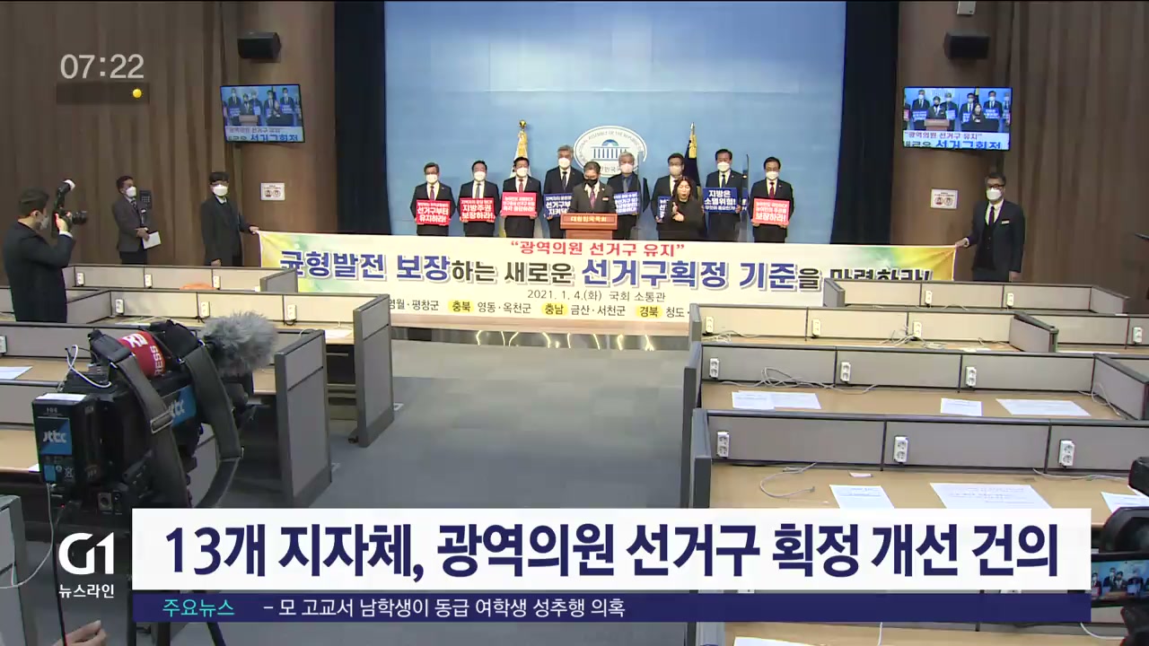 영월.평창.정선군을 비롯해, 헌법재판소 결정으로 광역의원 수가 줄어들 위기에 처한 전국 13개 지자체가 어제(4일), 국회에서 기자회견을 갖고, 광역의원 선거구 획정 개선을 촉구했습니다.