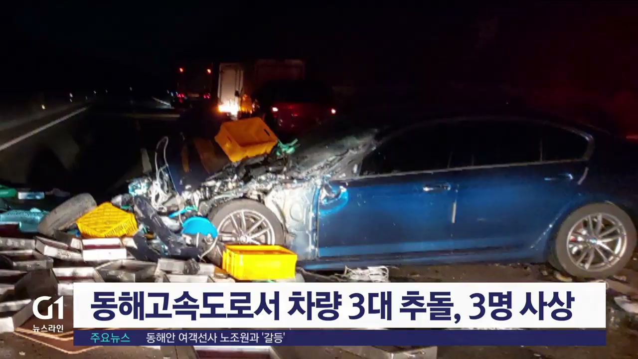 어제 (19일) 오후 6시 10분쯤 동해고속도로 삼척 방향 북강릉 나들목 인근에서 1톤 화물차와 20톤 화물차, 승용차가 잇따라 추돌했습니다.