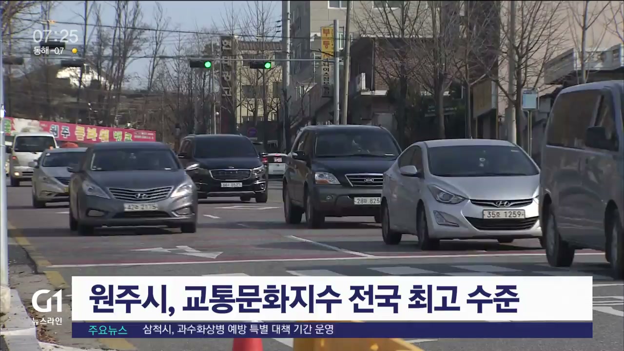 국토교통부와 한국교통안전공단이 전국 229개 자치단체를 대상으로 운전과 보행행태, 교통안전 등에 대해 조사한 결과, 원주시의 교통문화지수는 87.92점으로, 인구 30만명 이상 도시 중에서 가장 높았습니다.