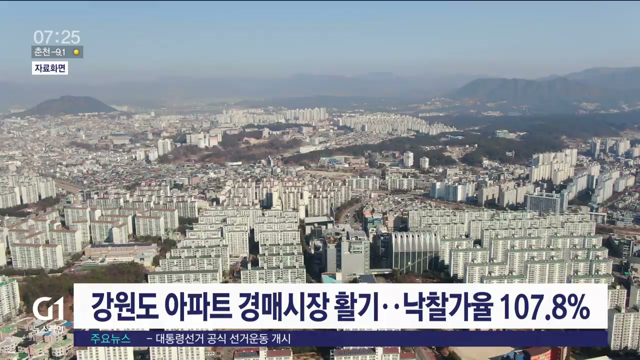 법원경매 전문기업 지지옥션이 발표한 '2022년 1월 경매동향보고서'를 보면, 지난달 강원지역 아파트 낙찰가율은 전달과 비교해 3.3% 포인트 상승한 107.8%로, 수도권 이외 지역 중 유일하게 100%대를 유지했습니다.