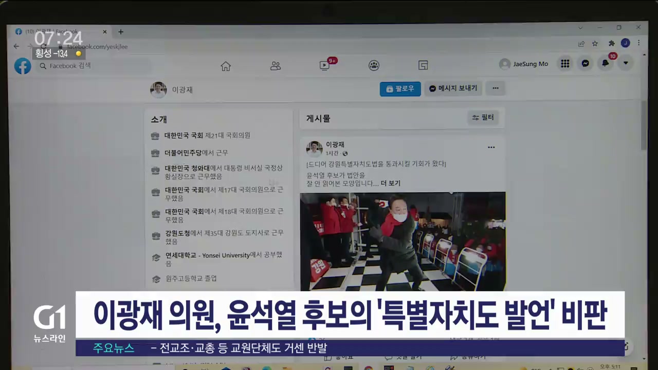 이광재 의원, 윤석열 후보의 특별자치도 발언 비판