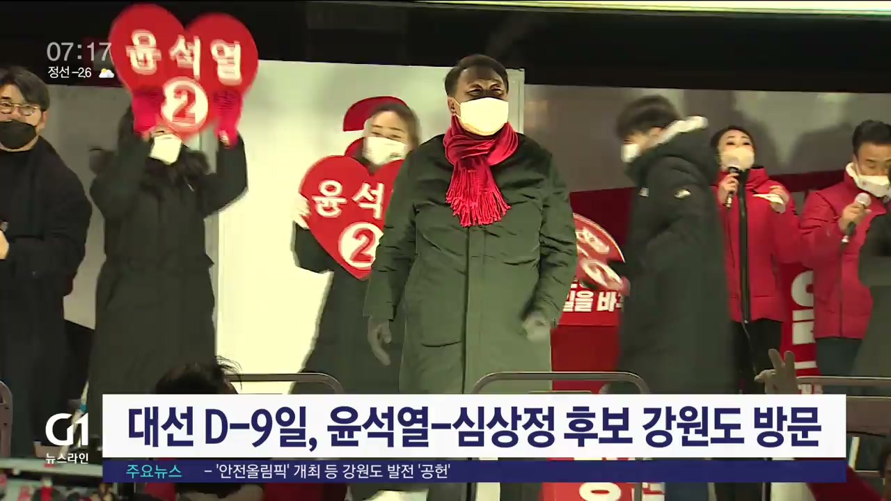 제20대 대통령 선거가 9일 앞으로 다가온 가운데, 국민의힘 윤석열·정의당 심상정 대선 후보가 오늘 강원도를 찾아 표심 공략에 나섭니다.