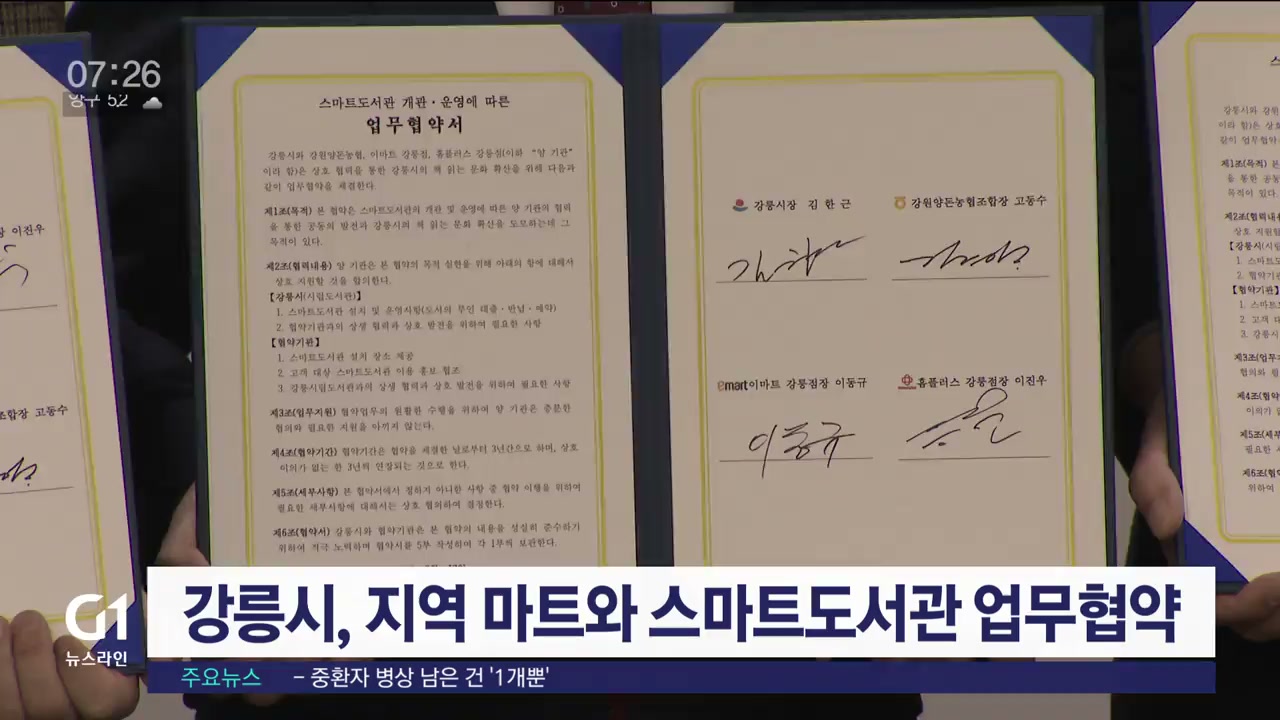 강릉시는 오늘 강원양돈농협과 이마트, 홈플러스와 함께 스마트도서관 개관과 운영을 위한 업무협약을 체결했습니다.