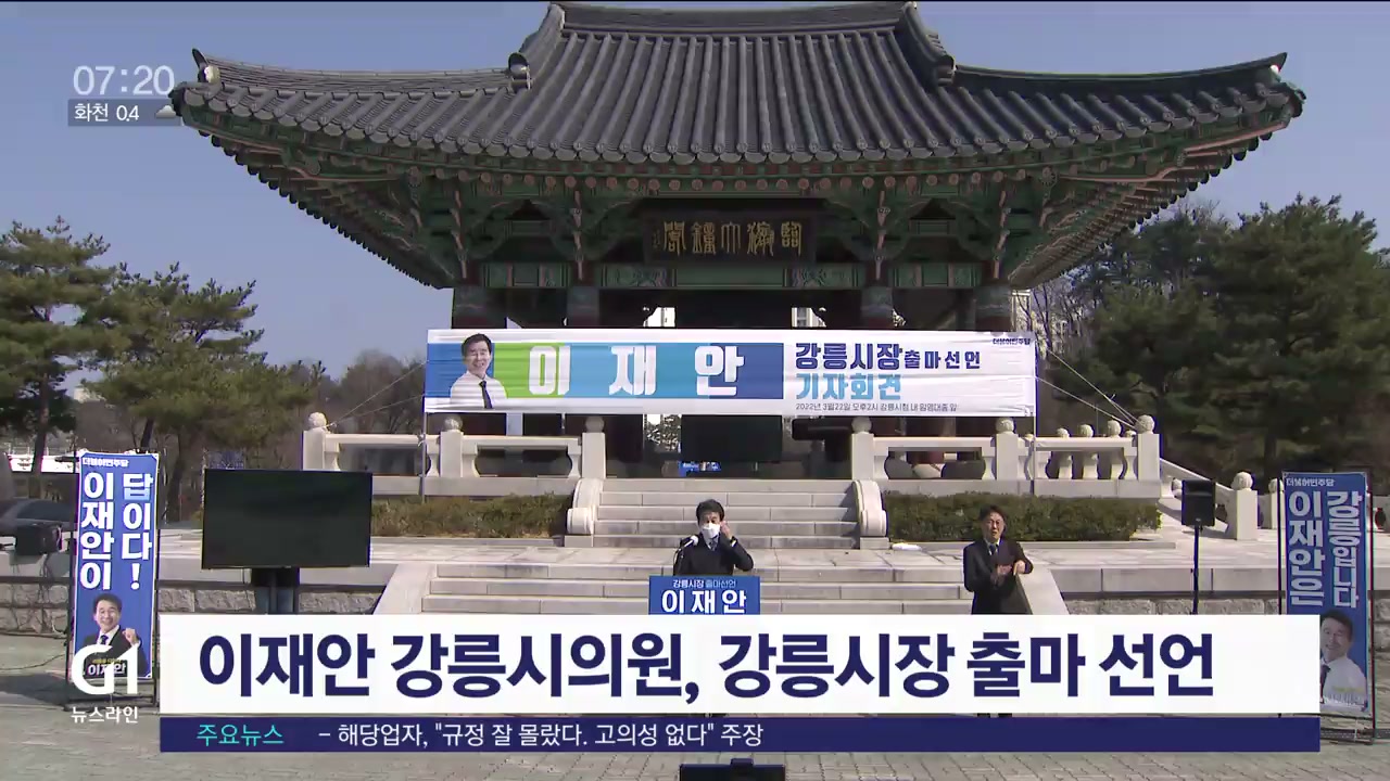 더불어민주당 이재안 강릉시의원은 어제(22일) 강릉시청 임영대종 앞에서 오는 6월 지방선거 강릉시장 출마를 선언했습니다.
