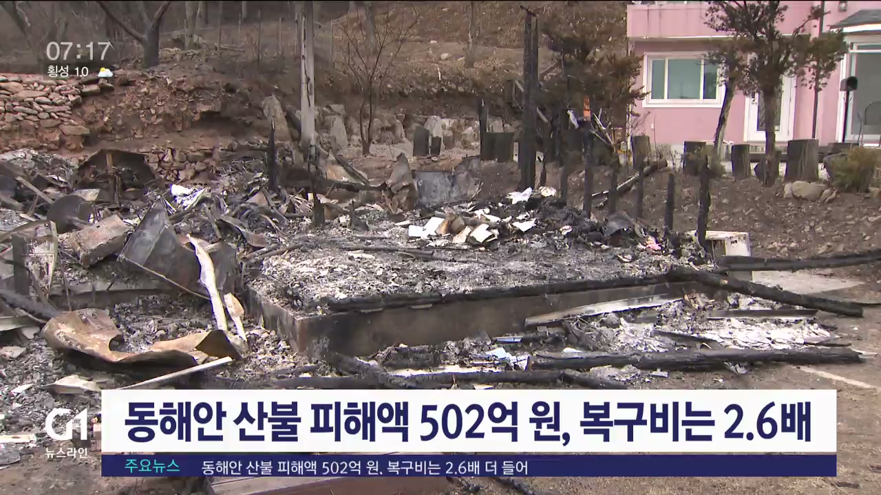 강원도 동해안 산불 피해액이 502억 원이며, 복구비는 피해액의 2.6배에 달하는 1,301억 원이 필요한 것으로 조사됐습니다.