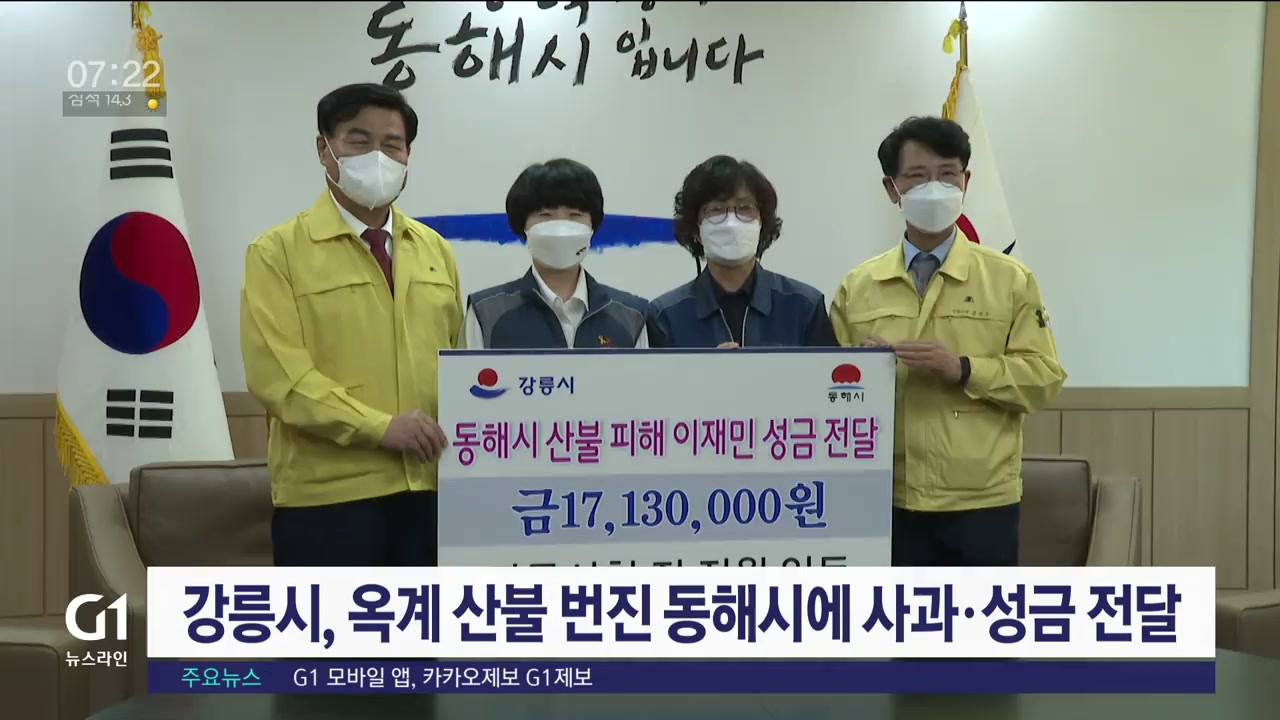 강릉시가 옥계면에서 발생한 산불이 동해시로 번져 피해를 입힌데 대해, 동해시에 사과하고 피해 복구 성금을 전달했습니다.