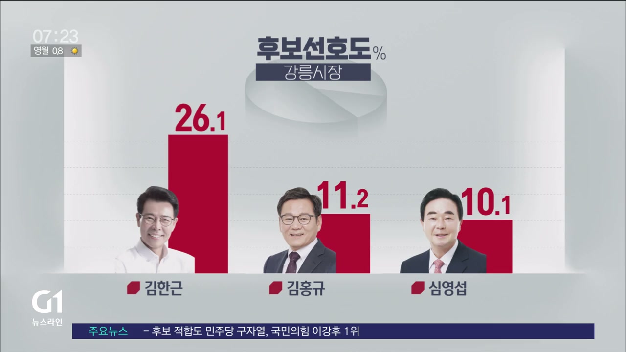 김한근 전 시장이 26.1%로 오차범위 밖 선두로 나섰고, 그 뒤를 김홍규 전 시의장 11.2%, 심영섭 전 시의장 10.1% 등으로 추격전을 벌이고 있는데, 3명 모두 국민의 힘 소속이어서 치열한 공천 경쟁을 예고했습니다./