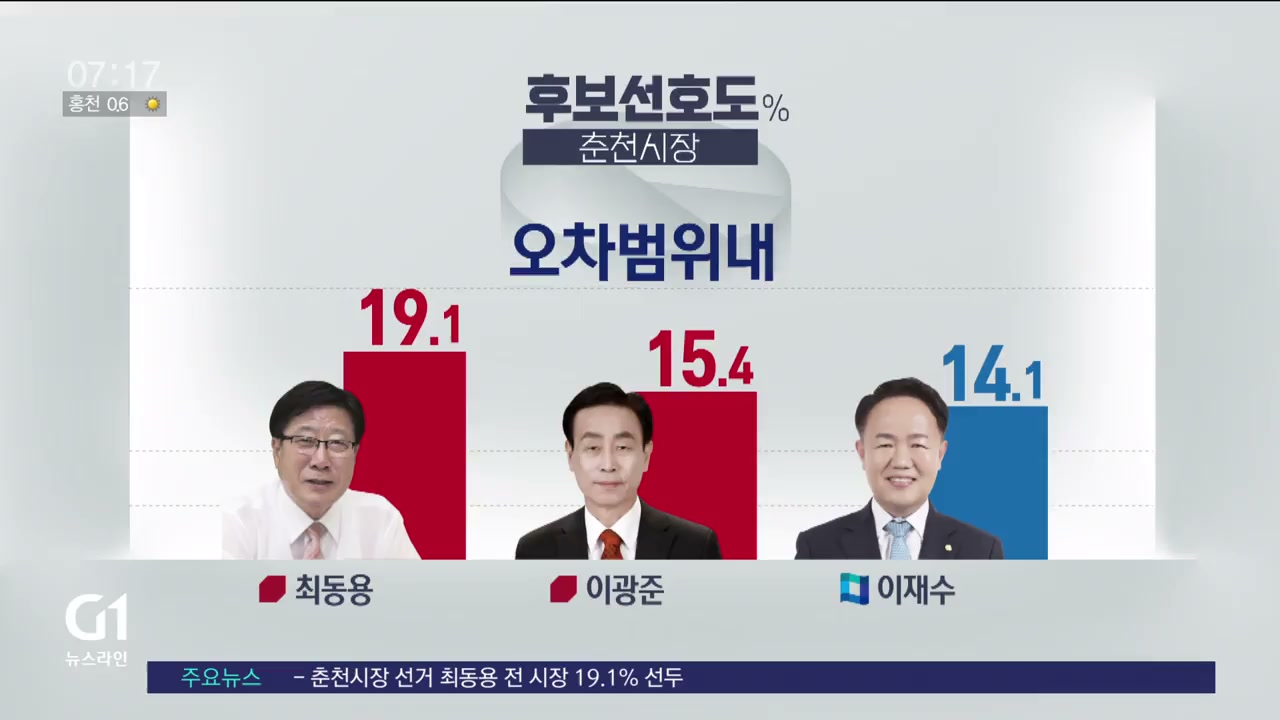 '시장으로 가장 낫다고 생각하는 인물은 누구냐'는 질문에 최동용 전 춘천시장 19.1%, 이광준 전 춘천시장 15.4%, 이재수 현 춘천시장 14.1%로, 1,2,3위가 오차범위 내에 분포했습니다./