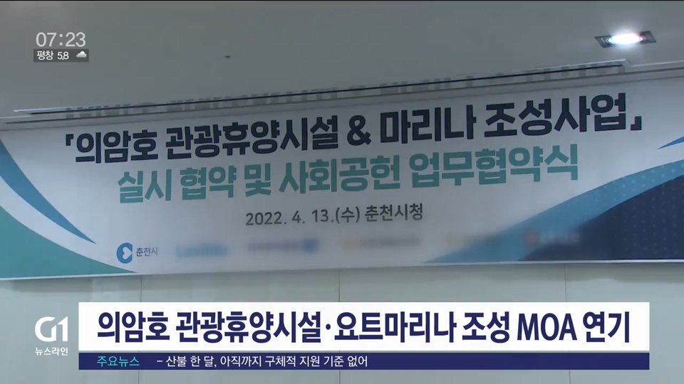 춘천시는 우선협상대상자인 라빌도 등 5개 컨소시엄 관계사와 의암호 관광휴양시설·요트마리나 조성 사업을 위한 실시협약을 진행하기로 했지만, 협약 직전 무산됐습니다.