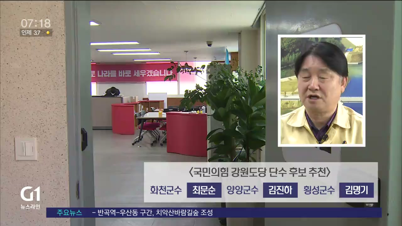 국민의힘 강원도당은 제5차 공관위 회의를 열고 화천군수 최문순, 양양군수 김진하, 횡성군수에 김명기 후보를 단수 후보 추천했습니다.