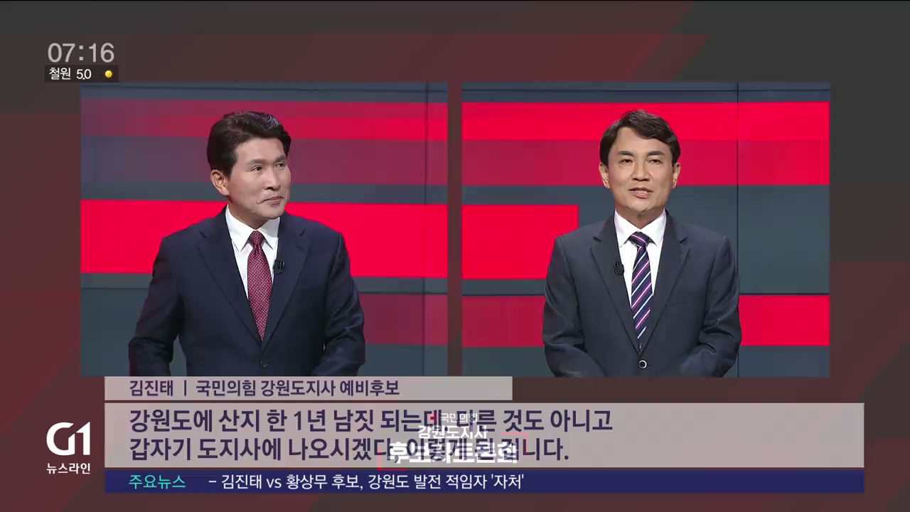 국민의힘은 이틀 후면 강원도지사 후보를 결정하는데요, 후보자 선출을 위한 토론회가 어제 G1방송 스튜디오에서 열렸습니다.