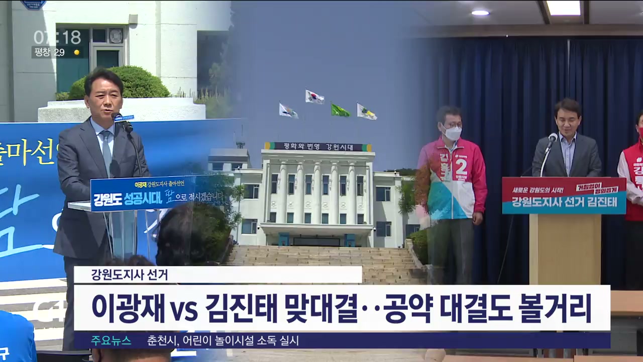 강원도지사 선거는 더불어민주당 이광재 후보와 국민의힘 김진태 후보의 맞대결로 치러집니다.