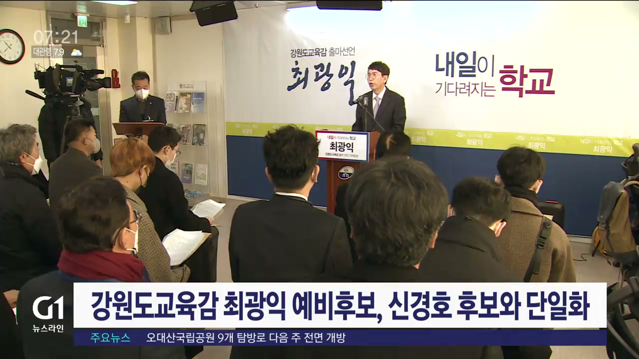 강원도교육감 최광익 예비후보가 신경호 후보 지지선언을 하면서 사실상 두 후보간 단일화가 이뤄졌습니다.