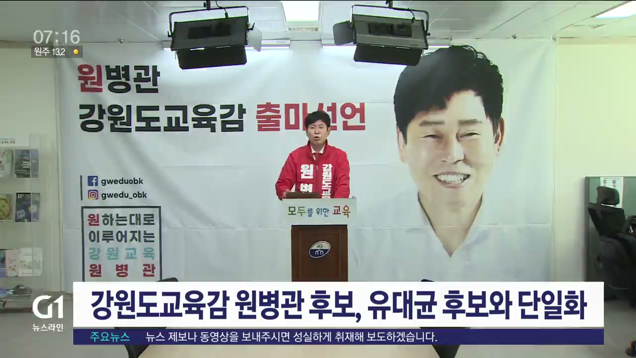 원병관 후보는 개인적인 사정으로 선거에서 중도 사퇴를 하게 됐다며, "나머지 후보들도 단일화를 해서 그동안 강원교육을 망쳐논 진보교육의 실태가 반복되지 않게 해달라"고 덧붙였습니다.
