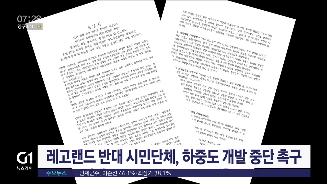레고랜드 중단촉구 범시민 대책위는(24일) 성명을 내고, 하중도 관광지 개발 중단을 재차 촉구했습니다.