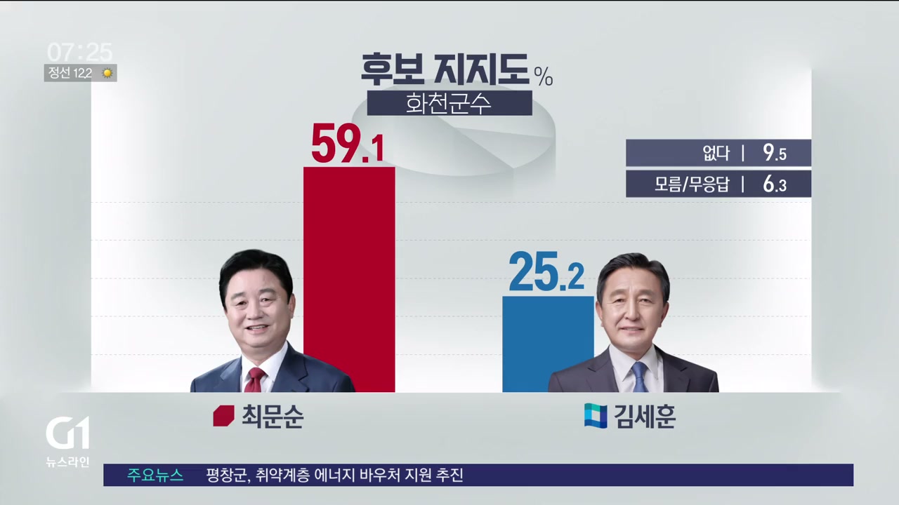 최문순 후보 59.1%, 김세훈 후보 25.2%로, 33.9%p 차로 오차범위 밖에서 최 후보가 우세한 것으로 조사됐습니다./