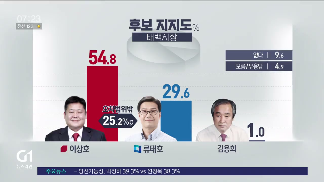 국민의힘 이상호 후보 54.8%, 더불어민주당 류태호 후보 29.6%로,