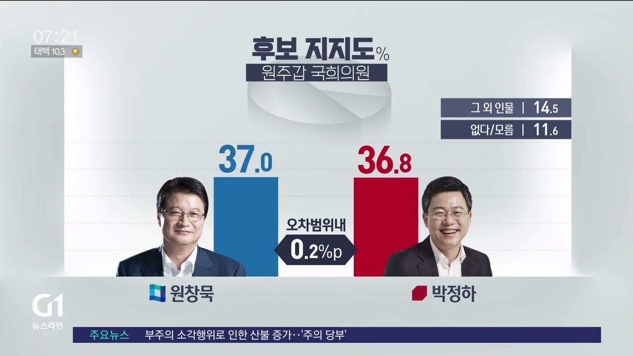 더불어민주당 원창묵 후보 37.0%, 국민의힘 박정하 후보 36.8%로