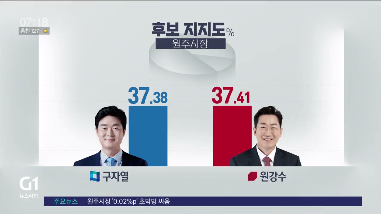 국민의힘 원강수 후보 37.41%, 더불어민주당 구자열 후보 37.38%를 기록했습니다.