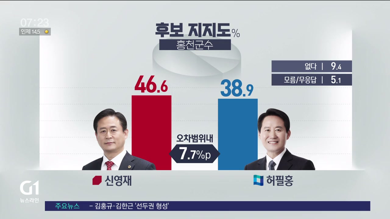 국민의힘 신영재 후보 46.6%, 더불어민주당 허필홍 후보 38.9%로 두 후보간 격차는 7.7%p, 오차범위 내 접전입니다./